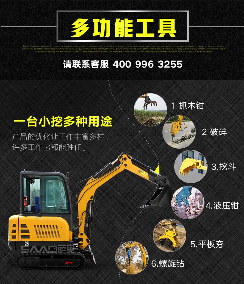 8、作業(yè)范圍廣,使用快速更換接頭,可選配旋挖鉆、破碎錘、裝載斗、抓具等各種屬具。