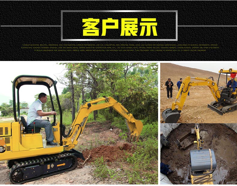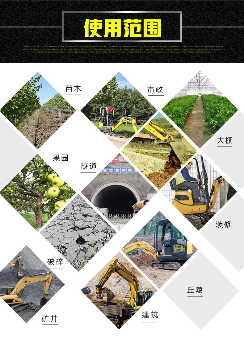 小型挖掘機主要適用于農(nóng)業(yè)蔬菜大棚的土地疏松,市政部門的園林綠化、果園苗圃栽樹挖坑、混凝土路面破碎,砂石料攪拌等空間狹小的施工作業(yè)等;是將來不斷替代人工,解放勞動力的理想設(shè)備。